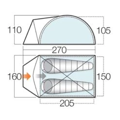 Deze koepeltent is voor twee tot drie personen. Voor mensen die niet lang reizen of een bijzet tent willen, is dit een perfecte koepeltent. Vaak wordt deze tent ook gebruikt als bijzet tent. Deze tent is namelijk licht van gewicht en klein verpakt. Zo kan de tent makkelijk meegenomen worden zonder dat het veel ruimte in neemt. De tent bestaat uit een enkel dat met een hordeur aan de voorzijde. Zo kan de tent goed ventileren wanneer je de deur open houdt, zonder dat er insecten binnen komen. In de nok van te tent zit er ook nog een ventilatiemogelijkheid.