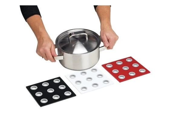 De onderzetter Domino is ideaal voor het serveren van warme schalen of pannen op tafel. De siliconen oderzetter is hittebestendig tot 220 graden en ook zorgt dit materiaal ervoor dat het niet kan schuiven.