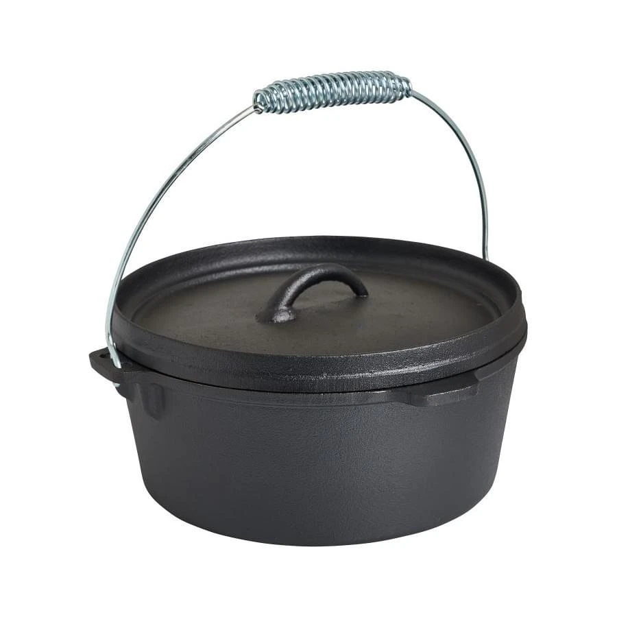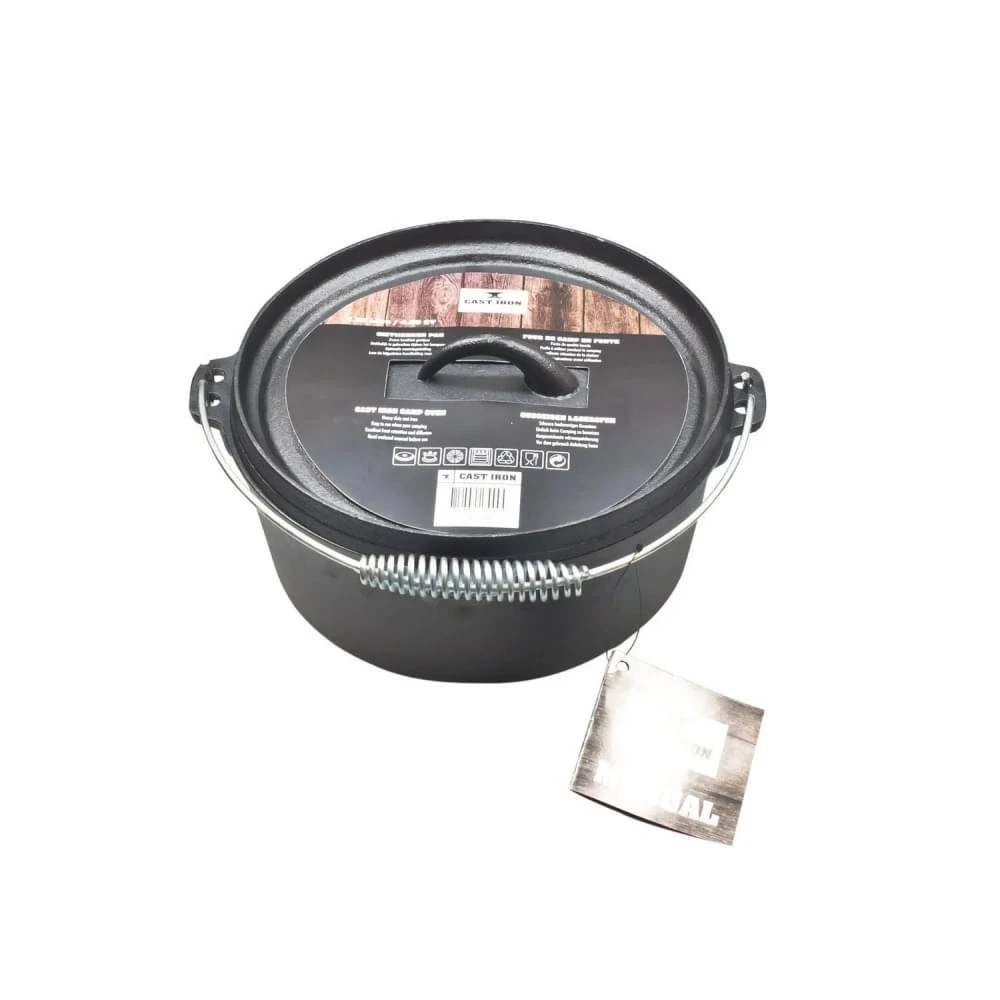 Bakken, braden of sudderen doe je in deze gietijzeren pan met deksel. Met zijn inhoud van 8 liter zijn gerechten als een stoofpot of soep ook geen probleem. Naast dat de gietijzeren pan twee handvatten heeft, heeft hij ook een hengsel zodat je hem ook boven open vuur kunt gebruiken.