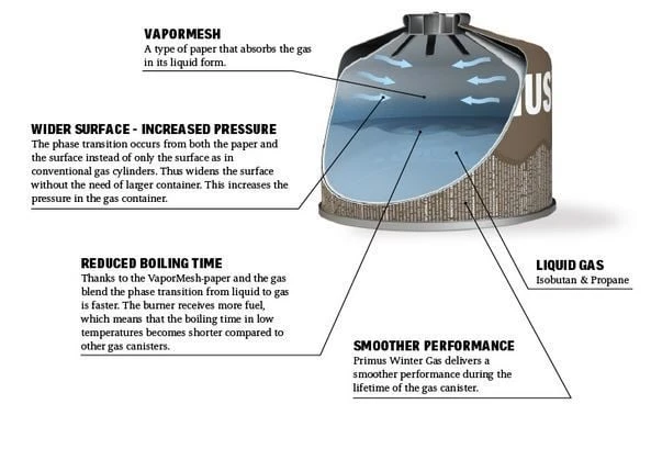 De belangrijkste innovatie achter Primus Winter Gas prestaties bij lage temperaturen is de Vapour Mesh. Dit is een sterk absorberend papier in de cassette dat de druk hoger zal blijven maken. De VaporMesh vergroot het oppervlak waarop het vloeibare brandstof kan verdampen in gas. Het verhoogde oppervlak maakt de overgang van vloeistof naar gas sneller.